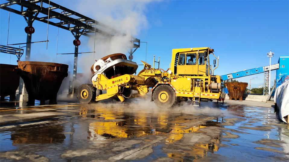 由中冶寶鋼研制的70噸鉸接式抱罐車,采用鵝頸鉸接型式,額定載重75噸,重載最高時速為每小時20公里,翻罐角度105度,最大爬坡能力8%,最小轉彎半徑9米。該車型應用專利技術10項,在國內有色冶煉市場占有率超過75%,先后榮獲中國有色工業協會、中國鋼鐵工業協會科技獎,中國施工企業管理和中國循環(huán)經濟協會專利獎等榮譽。